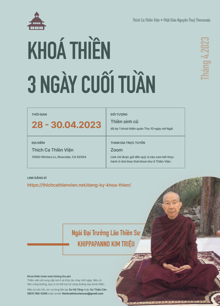 THÔNG BÁO KHOÁ THIỀN CUỐI TUẦN 3 NGÀY, 28-30 THÁNG 4 NĂM 2023 VỚI NGÀI THIỀN SƯ KHIPPAPANNO KIM TRIỆU