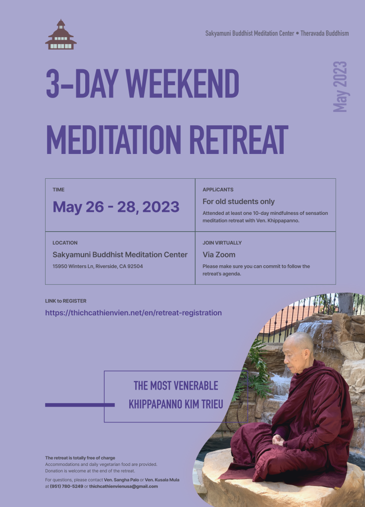 - Applicants: Only students who attended at least one 10-day or 3-day mindfulness of sensation meditation retreat with the most venerable Khippapanno Kim Trieu or at one of S.N. Goenka Meditation Centers.