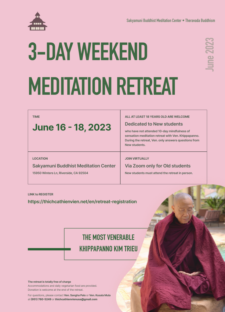 - This meditation retreat is dedicated to ALL NEW Students, who never attend a 10-day Mindfulness of Sensation meditation retreat with the most venerable Khippapanno Kim Trieu or at one of S.N. Goenka Meditation Centers. If you only attended a 3-day meditation retreat previously, please register as a New Student for this retreat to receive priority.